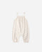 Spaghetti strap jumpsuit with fixed ties, a smocked back. elastic leg openings, and snaps down the inseam for easy changes - a go-to this season for your little one!